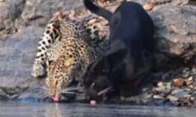 सांसें थाम देने वाला नजारा, तेंदुआ व ब्लैक पैंथर शांत जलाशय के किनारे साथ-साथ पानी पीते दिखाई दिए