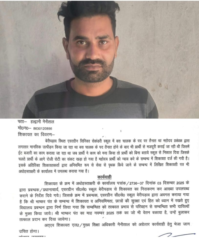 सीएन, लालकुआं/नैनीताल। बेरीपड़ाव स्थित एवरग्रीन सीनियर सेकेंडरी स्कूल में तैनात बस चालक भाष्कर पंत ने मानसिक उत्पीड़न, मजदूरी कराए जाने और बिना सूचना सेवा से पृथक किए जाने की शिकायत सीएम हेल्पलाइन (शिकायत संख्या 9013358) में दर्ज कराई थी। चालक का आरोप है कि स्कूल प्रबंधन बस संचालन के बजाय उससे ईंट-बजरी ढुलवाने जैसे मजदूरी कार्य कराता था। विरोध करने पर उसे बिना बताए नौकरी से हटा दिया गया, जिससे उसके सामने आजीविका का संकट खड़ा हो गया। इस मामले में उसने खंड शिक्षा अधिकारी कार्यालय में भी लिखित शिकायत दी थी। शिकायत के बाद खंड शिक्षा अधिकारी, हल्द्वानी ने 3 दिसंबर 2025 (पत्रांक 2736-37) को स्कूल प्रबंधन और प्रधानाचार्य से आख्या मांगी। जवाब में प्रबंधन ने कहा कि विद्यार्थियों की सुरक्षा को देखते हुए भाष्कर पंत को परिवहन दायित्वों से तत्काल प्रभाव से मुक्त किया गया है। साथ ही बताया कि उन्हें नवंबर 2025 तक का बकाया वेतन भुगतान के लिए बुलाया गया है। मामले की जांच आख्या और पूरा प्रकरण अब मुख्य शिक्षा अधिकारी, नैनीताल को अग्रेतर कार्रवाई के लिए भेज दिया गया है।
