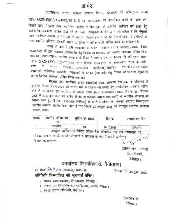 सीएन, नैनीताल। जिलाधिकारी नैनीताल ललित मोहन रयाल ने 18 अक्टूबर 2025 (धनतेरस) के अनुसार स्थानीय अवकाश घोषित कर दिया गया है। इस संबंध में जारी आदेश में कहा गया है कि शासन द्वारा पूर्व में 01 अक्टूबर 2025 को महात्मा गांधी जयंती के स्थान पर स्थानीय अवकाश घोषित किया गया था, लेकिन अब 18 अक्टूबर 2025 (धनतेरस) के अनुसार स्थानीय अवकाश अवकाश घोषित कर दिया गया है। धनतेरस पर्व पर जिलाभर के सरकारी कार्यालय, कोषागार और संस्थान बंदे और कर्मचारी अपने परिवारजनों के साथ त्योहार मनाए जाने की घोषणा की गई।