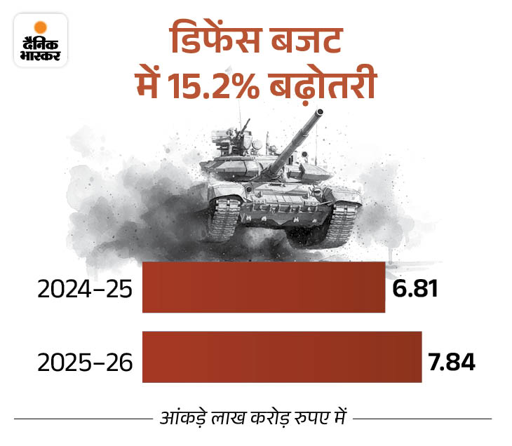 ऑपरेशन सिंदूर के बाद पहले बजट में सीतारमण ने जियो-पॉलिटिक्स और चुनौतियों की बात कही और देश का रक्षा बजट ₹6.81 लाख करोड़ से बढ़ाकर ₹7.85 लाख करोड़ कर दिया। यानी कुल डिफेंस बजट में 15.2% की बढ़ोतरी हुई है।